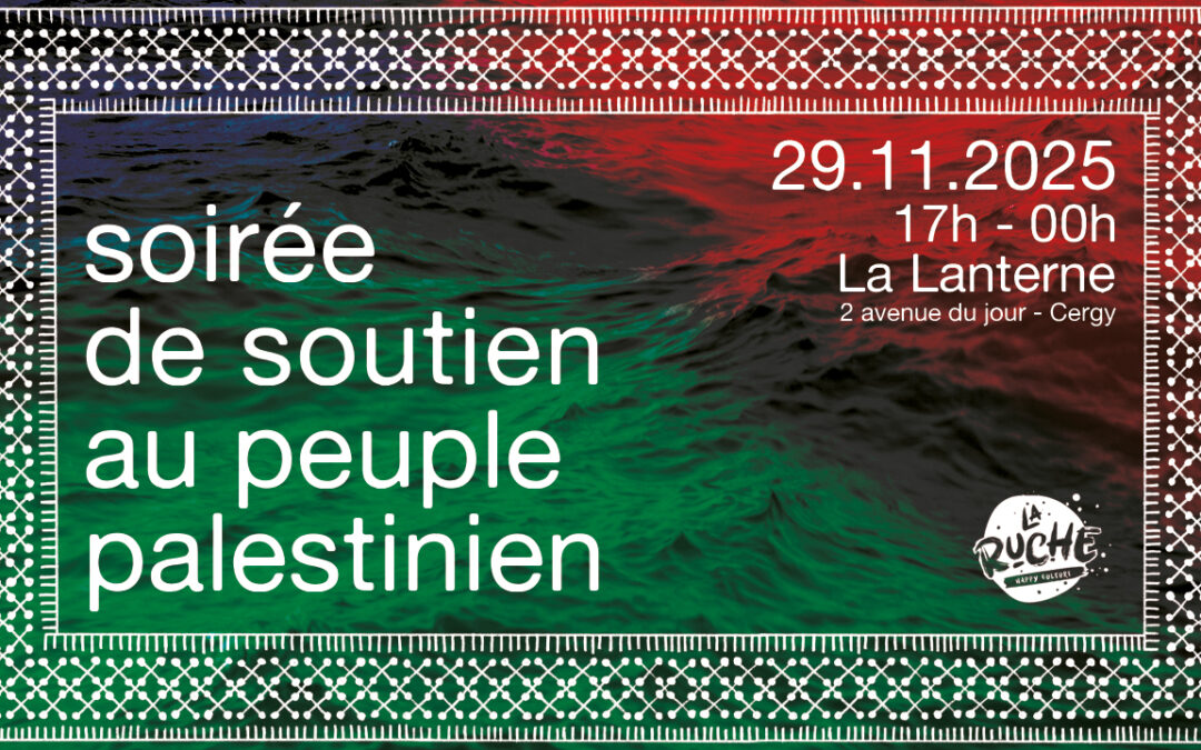 Face au génocide en cours en Palestine et plus particulièrement à Gaza, La Ruche organise une soirée artistique et solidaire le samedi 29 novembre 2025 à La Lanterne de Cergy (95).
